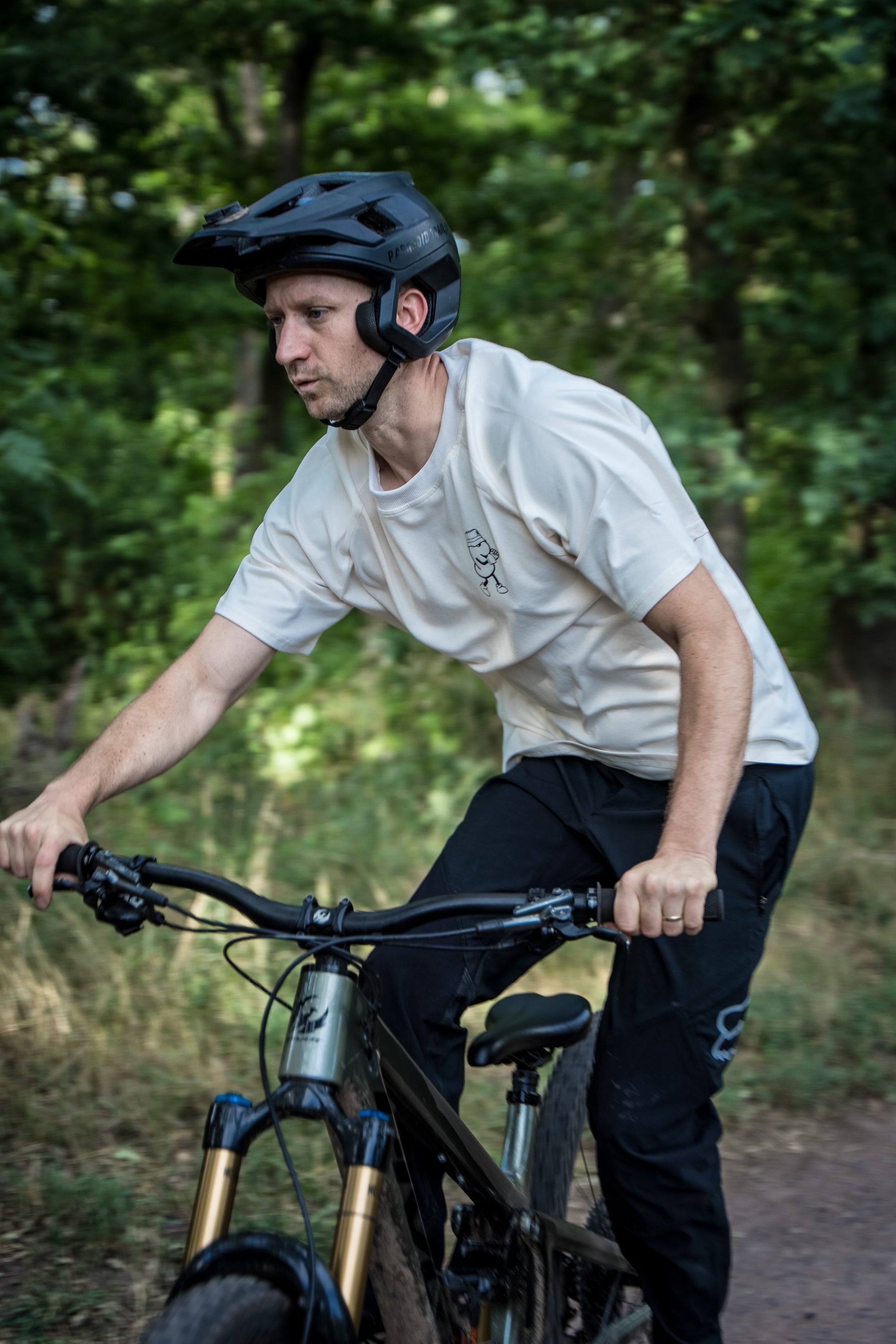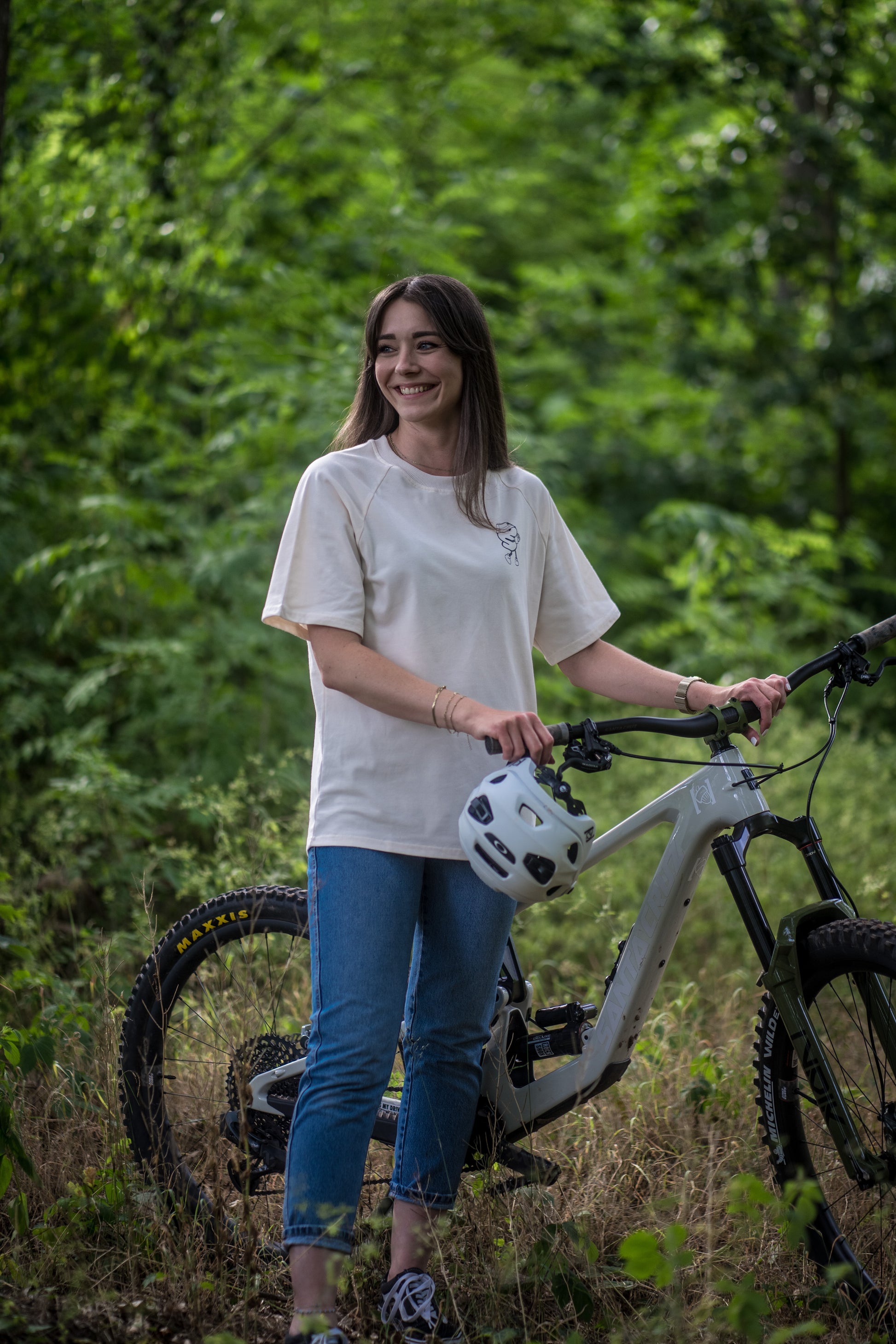 Das Stoffgemisch bringt ordentlich Gewicht auf die Waage, passend zum oversized Fit. Den Kragen haben wir etwas großzügiger geschnitten, damit Du auch bei steilen Anstiegen nicht überhitzt. Außerdem ist das Shirt dank elliptischem Abschluss hinten etwas länger, damit das Shirt auch auf dem Bike noch perfekt sitzt.